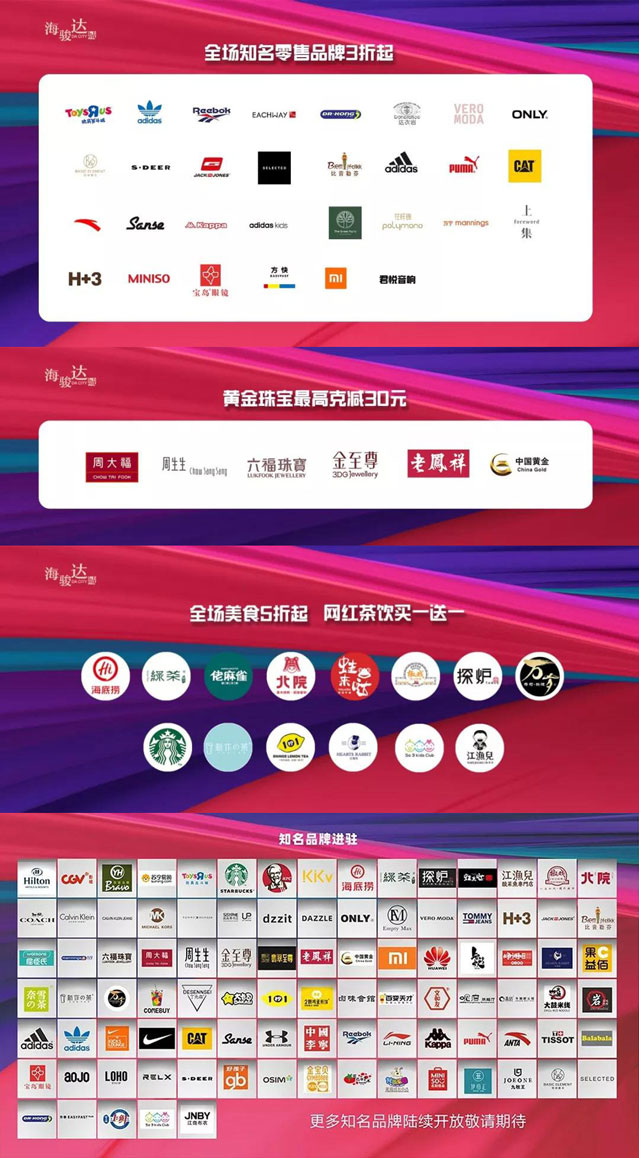 除了各種活動(dòng)外,海駿達(dá)城在開放當(dāng)天還聯(lián)合各大品牌商家實(shí)行多重優(yōu)惠重磅輸出,鉅惠全城。轉(zhuǎn)發(fā)有禮,會(huì)員專享積分,零售品牌全場最低3折,餐飲品牌全場最低5折,黃金最高克減30元等。其中,玩具反斗城滿200送100、滿100減50;VERO MODA全場5折起;Adidas originals全場8折;金至尊彩金鉆石滿1000立減300;海底撈送送菜卡;椒戲酸菜魚5折……吃喝玩樂購,應(yīng)有盡有,一應(yīng)俱全,瞬間滿足。